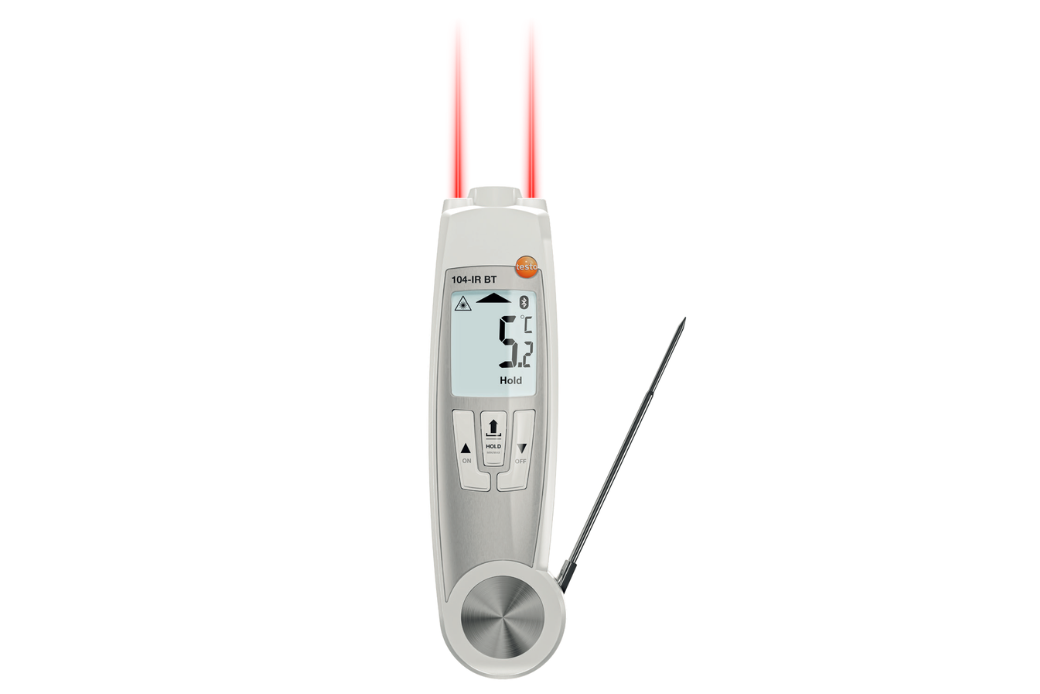 The testo 104-IR BT enables non-contact measurement of surface temperatures and also offers the option of measuring the core temperature if upper or lower limit values are violated. All measurement values are automatically transmitted to the testo Smart App via Bluetooth – reliably and securely.