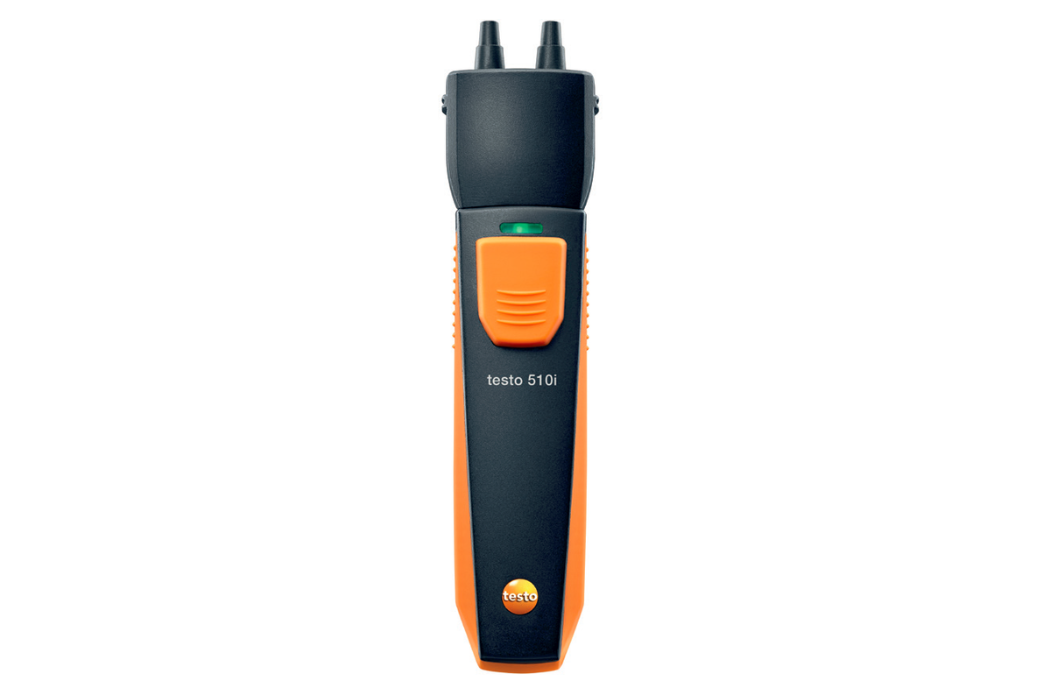 The testo 510i differential pressure measuring instrument, used in conjunction with a smartphone or tablet, is suitable for quick and easy measurement of gas flow pressure and static pressure, as well as pressure drops on fans and filters