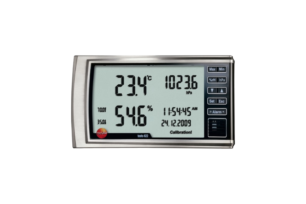 The testo 622 digital hygrometer and barometer is ideal for monitoring the ambient air. The meter measures the air temperature, relative humidity and the air pressure at a rate of once every ten seconds and displays the values – including the time and date – on the large easy-to-read display. A visual LED alarm alerts the room’s occupants when the threshold is exceeded.