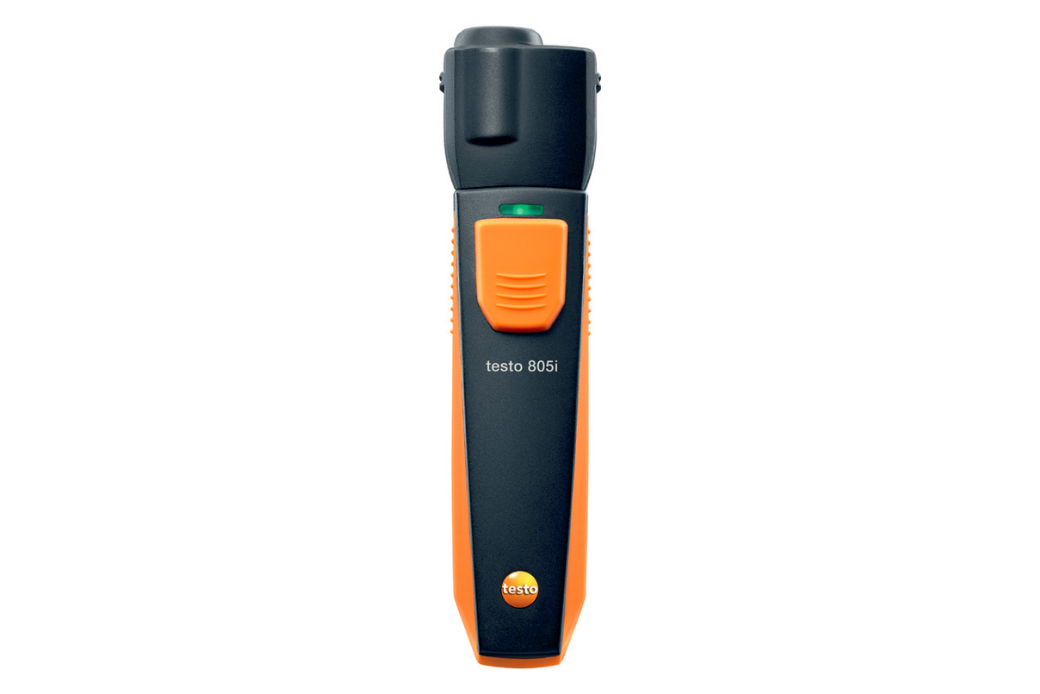 The testo 805i infrared thermometer, in conjunction with a smartphone or tablet, functions as a compact IR thermometer for wall temperatures, as well as fuse and component temperatures in air conditioning systems. The measuring point is marked clearly with a laser circle made up of eight dots – so you always know precisely where to measure.