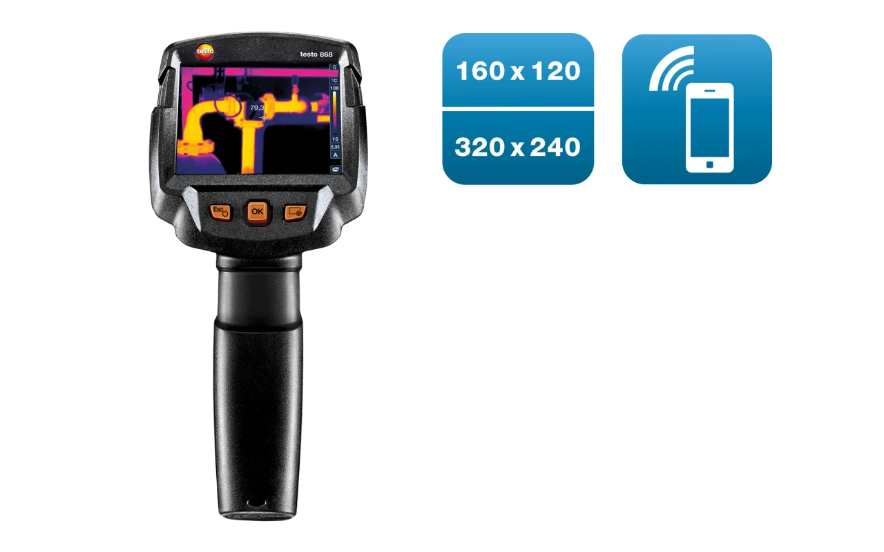testo 868 thermal imager, we have developed a thermal imager which makes work quicker and easier – without foregoing professional thermal imaging technology. You can generate error-free and objectively comparable infrared images using its handy functions. The IFOV warner, testo ɛ-Assist and testo ScaleAssist mean you can avoid measurement errors and not only effortlessly achieve optimum setting of emissivity (ɛ) and reflected temperature (RTC) for building thermography, but also of colour scale.